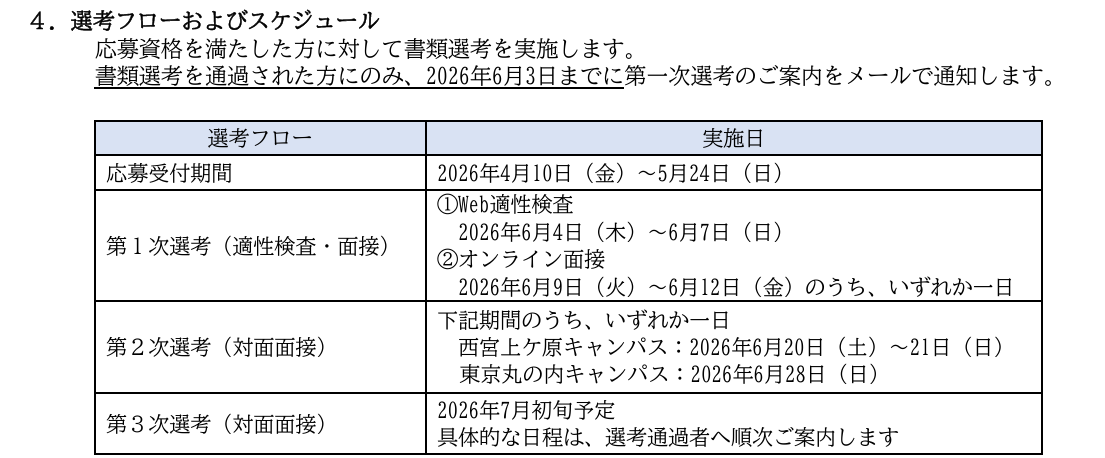 いつどこで募集が出るかわからないことが多い中途採用募集において、このような形で大学側も計画的に行ってくれるのは非常にありがたいと思う反面、応募するライバルも多少多くなるのだろうなと感じます。