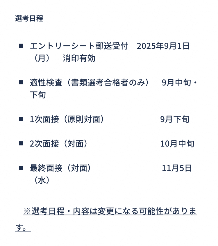 応募書類の提出、適性検査(web)、面接3回の試験内容となっています。